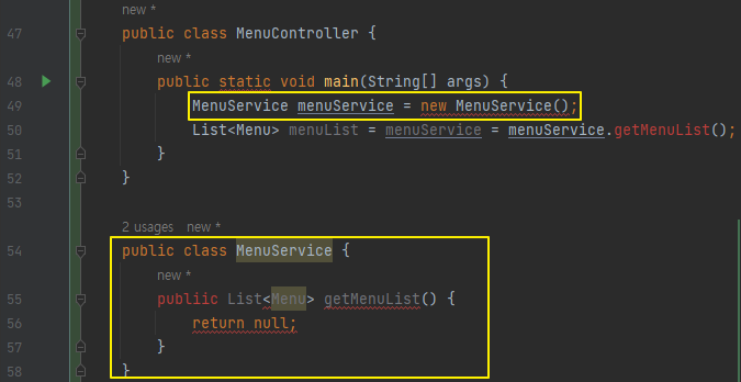 - 이 예시는 MenuController 생성자로 MenuService의 객체를 전달 받고 있음