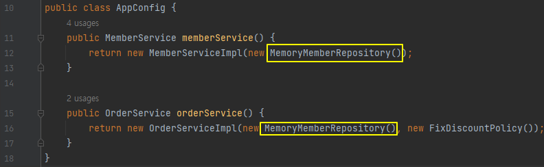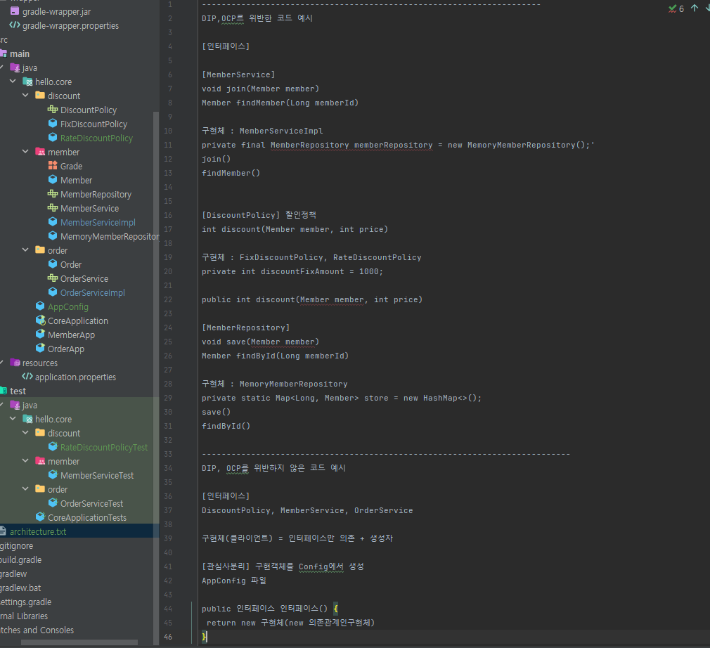 - AppConfig 파일을 생성해서 구체적인 구현 객체 생성을 AppConfig에서 담당 (관심사 분리)