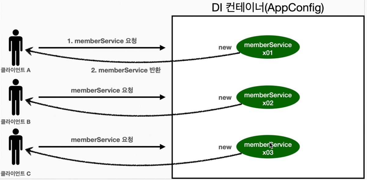 - 아래 사진은 웹 어플리케이션 특성상 여러 요청이 올때의 DI 컨테이너 동작을 사진으로 표현한 것