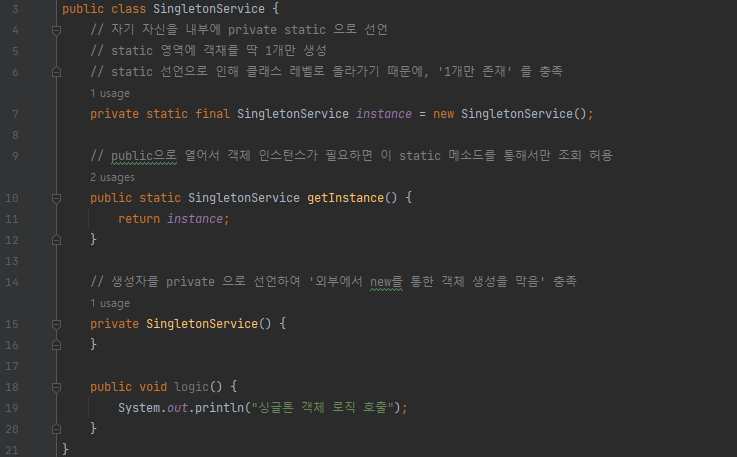 스프링 컨테이너가 객체를 기본적으로 Singleton으로 만들어서 관리하기 때문에 그럴 필요가 없음
