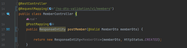 핸들러 메소드인 postMember에 DTO클래스를 적용하기 전