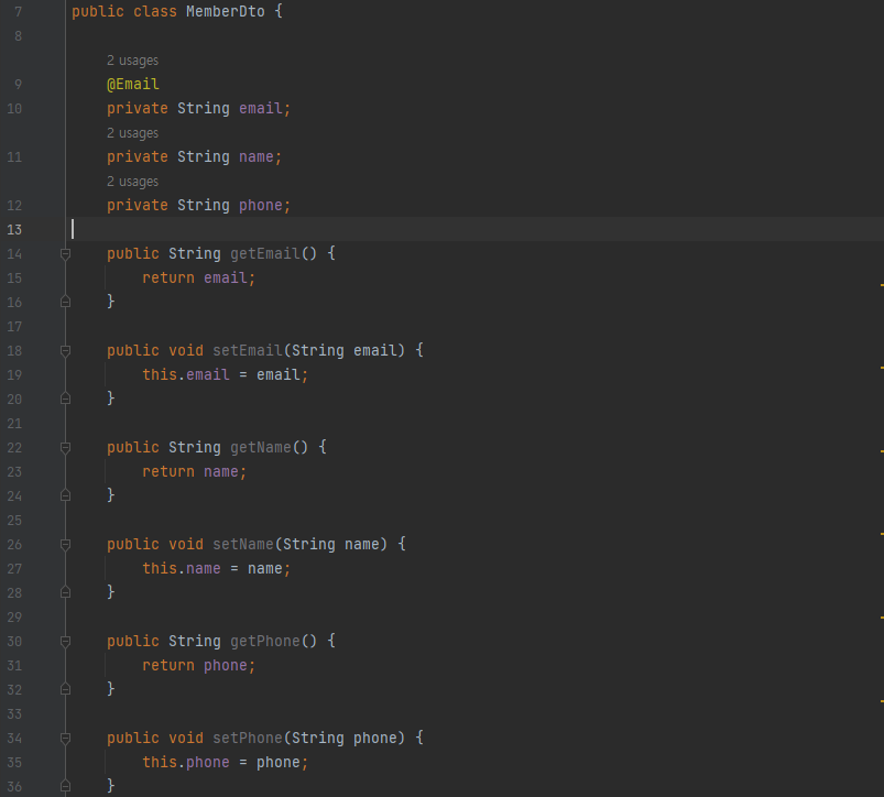 - DTO 클래스를 적용함으로써 코드의 간결성을 충족시킬 수 있다.