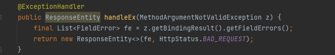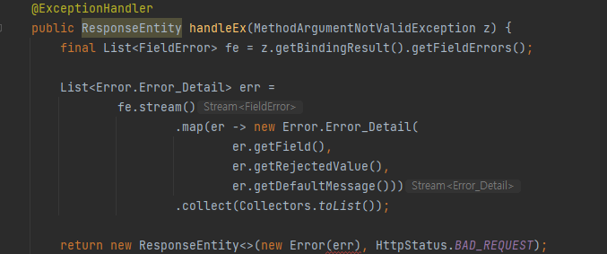 - 그 후, MethodArgumentNotValidException 개체에서 getBindingResult(), getFieldErrors() 를 통해,