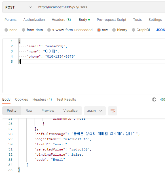 - RequestBody에 유효하지않은 데이터 요청이 오면, 유효성 검증에 실패