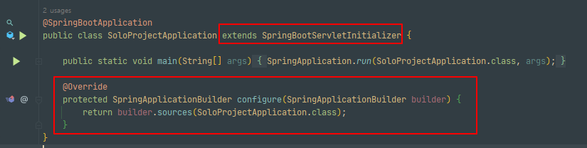- 실행 클래스에 SpringBootServletInitializer를 extend 해주고 아래 메소드 작성