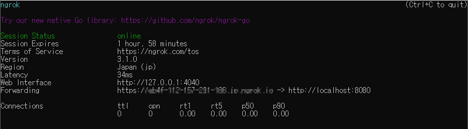 - 8080포트와 포워딩되는 임시 도메인 발급, 세션 지속시간 확인 가능