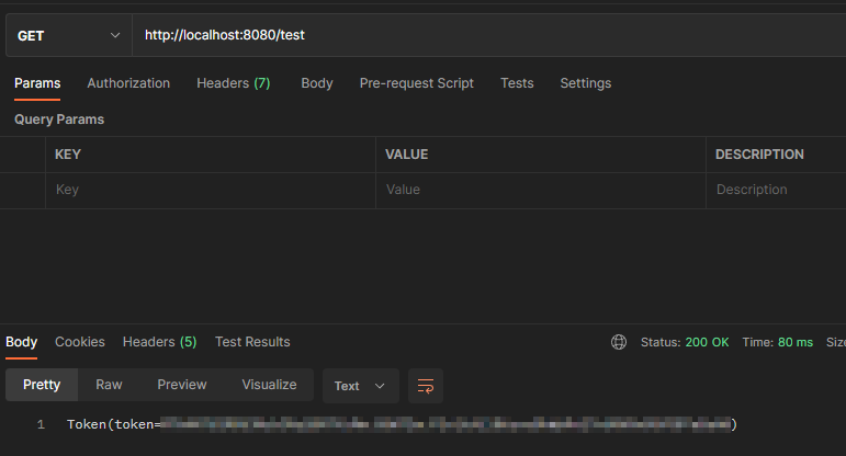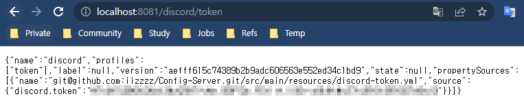localhost:8080/test (Config 클라이언트)를 들어가보면 암호화와 토큰 값이 잘 나오는 걸 볼 수 있다.