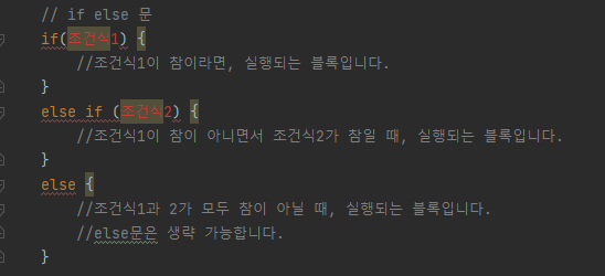 - if의 조건식이 true면 해당 블록이 실행되고, false면 else if 조건식 검사하고 false면 else 실행