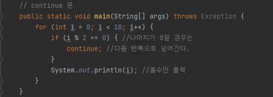 - continue ,break 의 차이점은 반복문 종료여부임. continue는 반복종료X 다음차례로 넘어가 계속 반복