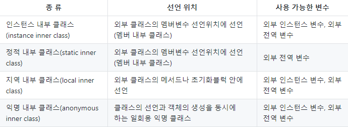 ex) 외부 클래스에 포함될 수 있는 3가지의 내부 클래스의 종류 (익명 내부클래스 제외)