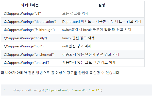 | @SuppressWarning | 컴파일러가 경고메세지를 나타내지 않음 |