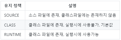 | @Retention | 애너테이션이 유지되는 기간을 정하는데 사용한다. |