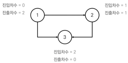 - 진입 차수(Indegree) : 특정한 노드로 들어오는 간선의 개수